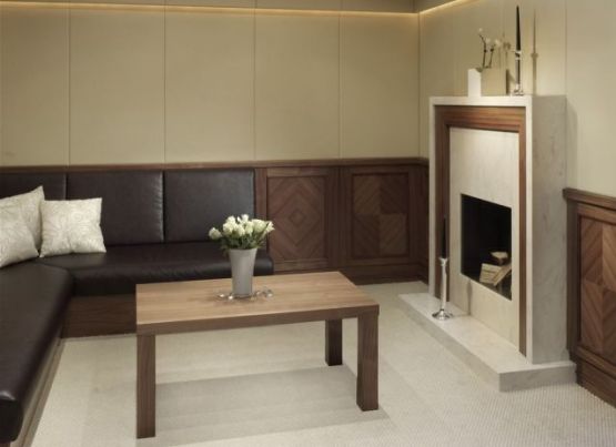 Az Enterieur Navy nappali-konyha együttesének meghatározó anyaga a diófurnér, ami nemes megjelenést kölcsönöz a bútoroknak. Az összeállítás unikuma az intarziás technikával kialakított dióbetétes frontok alkalmazása. A motívum az oldalfalburkoláson is megjelenik. A falakat bőrrel borítottuk, a kazettás mennyezet belseje magasfényű akril, mely a visszatükröződésnek köszönhetően tágítja a teret. A konyhabútor viszonylag kis alapterületen helyezkedik el, ötletes megoldásainak köszönhetően mégis számtalan rakodóhelyet biztosít. A munkapult, a hátfal és a mosogatómedence ugyanolyan színű corianból készült, ami a nappali kandalló burkolásában is megjelenik. A hézagmentes illesztéseknek köszönhetően maximális higiéniát biztosít. A konyhatérhez csatlakozó ücsörgő, a kényelmes bőr ülőgarnitúrával és kandallóval, meghitt beszélgetések színhelyéül szolgál.