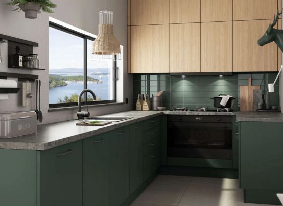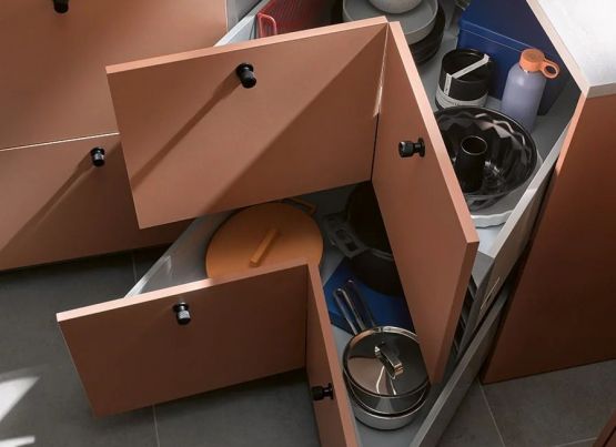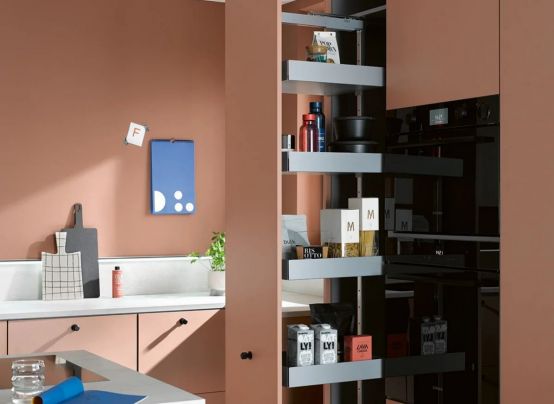 Szín és anyagok: Meleg terrakotta konyhaszekrények matt felülettel, világosszürke felsőszekrények üvegezett ajtókkal, fehér munkalap – mind "Made in Germany" minőségben, fenntartható alapanyagokból.