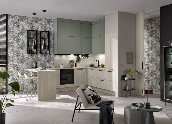 Kiegészítők: Fekete fém lábazatú bárszékek, zöld növénydekoráció és ízléses kiegészítők fokozzák a hangulatot, ideális nyitott konyhákhoz vagy étkezőkhöz.