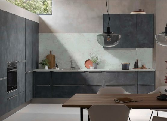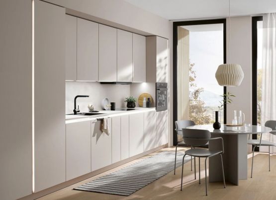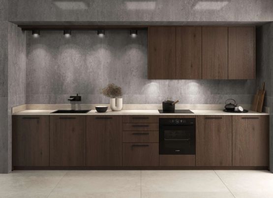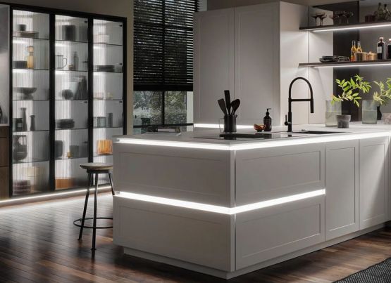 A fogantyú nélküli ajtók, fiókok, érintésre nyílnak és záródnak. A munkapult megfelelő megvilágításáról LED fény gondoskodik, melyet a felső elemsorba építettünk be.