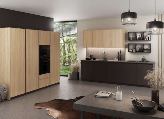 Mélyített pórusú, olajozott felületű tölgyfa és magasfényű festett frontok kombinációjából született a Bányai konyhabútor összeállítás.Mélyített pórusú, olajozott felületű tölgyfa és magasfényű festett frontok kombinációjából született a Bányai konyhabútor összeállítás. A szigethez kapcsolódó oszlopba építettük be a konyhagépeket.